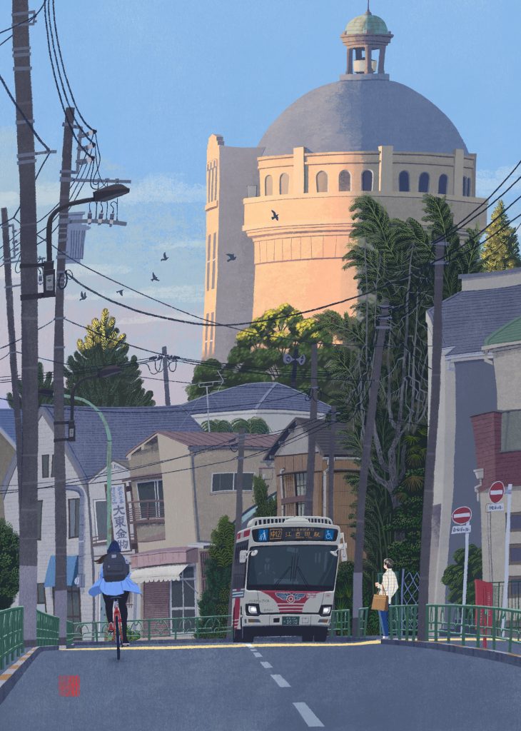 ミステリアスな牢獄とか悪党一味のアジトとかを連想させる不気味な印象もあって、江戸川乱歩の少年冒険モノの挿画なんかにもこの種の塔楼が描かれていたはずだが、自転車で走っているときに、ヌウッと水道タンクが道の先に現われたりすると、おもわずゾクッとしたものだ。好みの水道タンクのポイントはいくつかあるのだが、あーここ、小川さんに描いてもらいたいなぁ……と思ったのが、旧中野通り(哲学堂通り)の芳花園住宅というバス停のあたりから南方を眺めたショット。ゆるやかに湾曲する道を走るバスは、赤いカラーが目をひく関東バスで、傍らの木立ちの緑とのコントラストも良い。